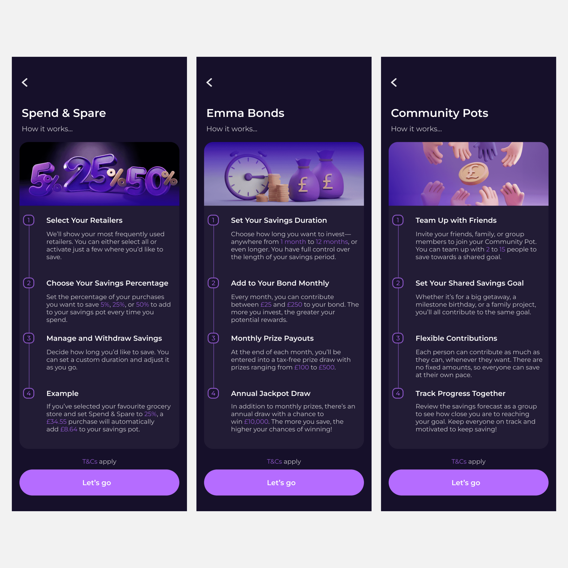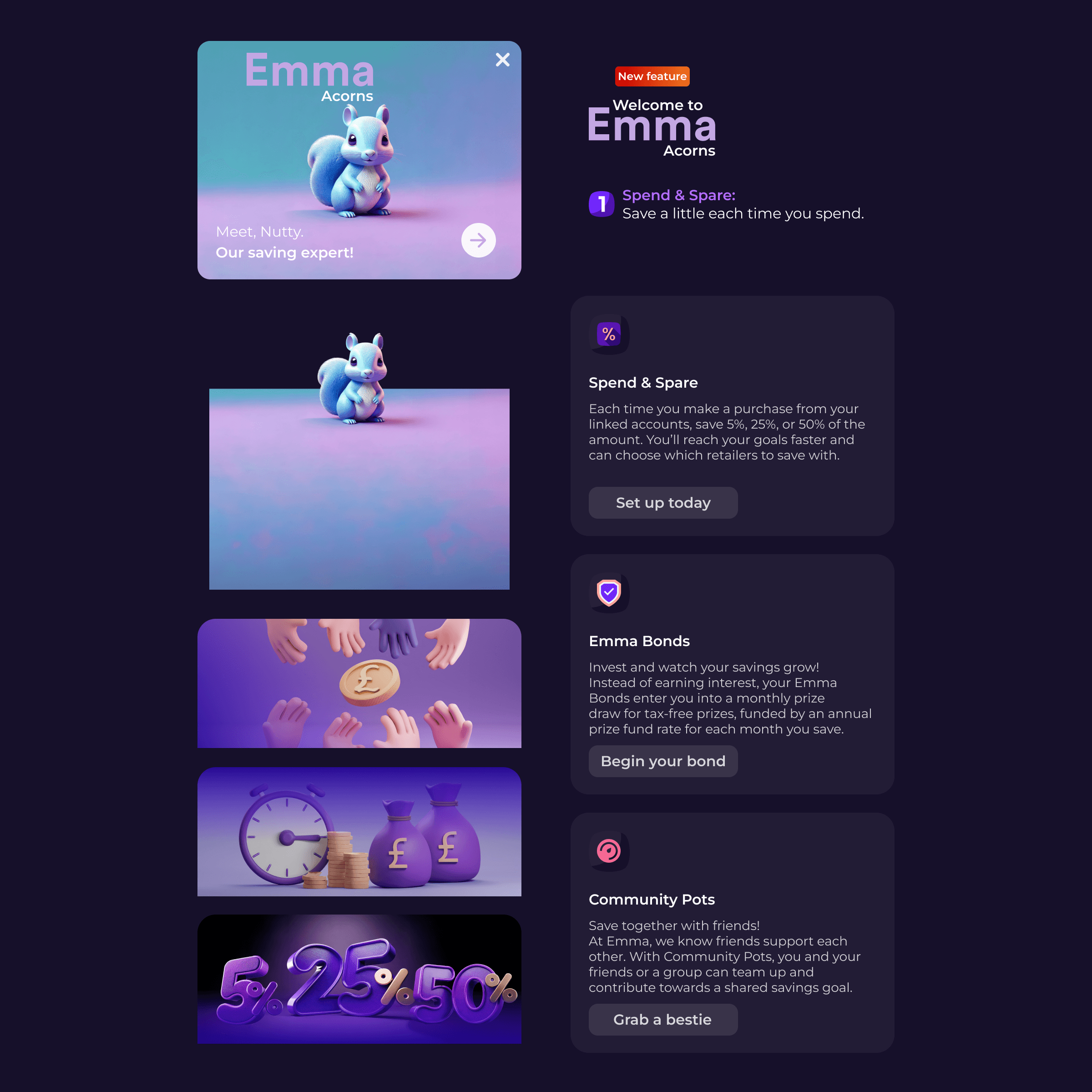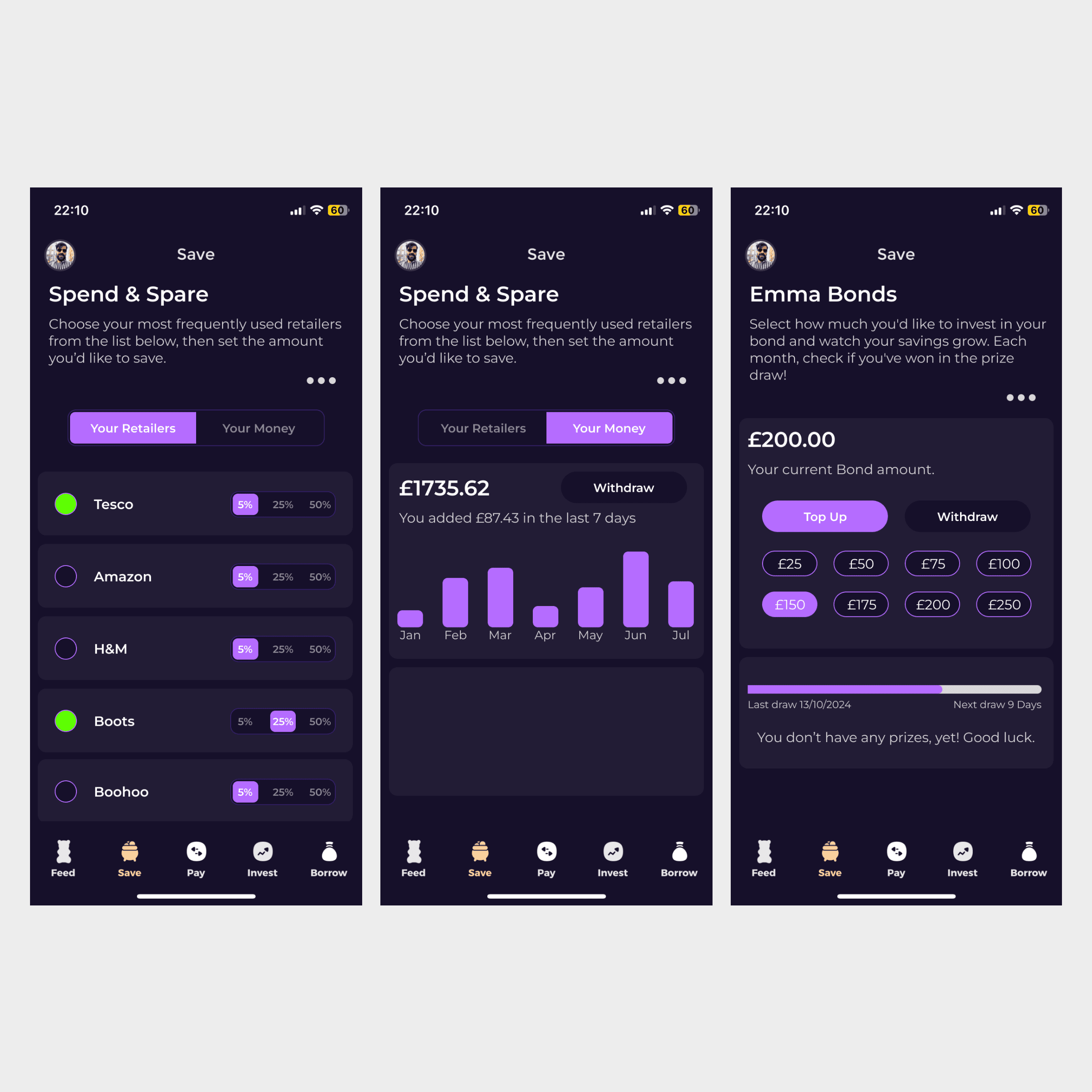 Working from early ideas through to final interface design, I created a 12-screen high-fidelity flow that introduces and supports three innovative savings tools: Spend & Spare, Emma Bonds, and Community Pots.